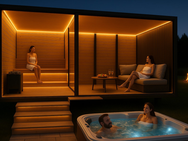 Promišljen raspored prostorija (6,0 x 2,5 m) – sauna s velikodušnim ostakljenjem i prostorom s hidromasažom i prostorom za opuštanje – opremljena jacuzzijem za 5 osoba s grijanjem, 28 zračnih mlaznica, LED rasvjetom i pneumatskim upravljanjem.